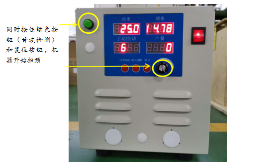 3) 第一次使用或更换新换能器,需要开机后进行音波检测,后续可以直接开机使用。音波检测方法:松开刀具,使换能器不受力,功率调到10%,接着同时短按面板左侧绿色按钮(音波检测开关)和“复位”按钮开始扫频,系统从最低频开始快速扫描,扫到谐振频率后自动停止。